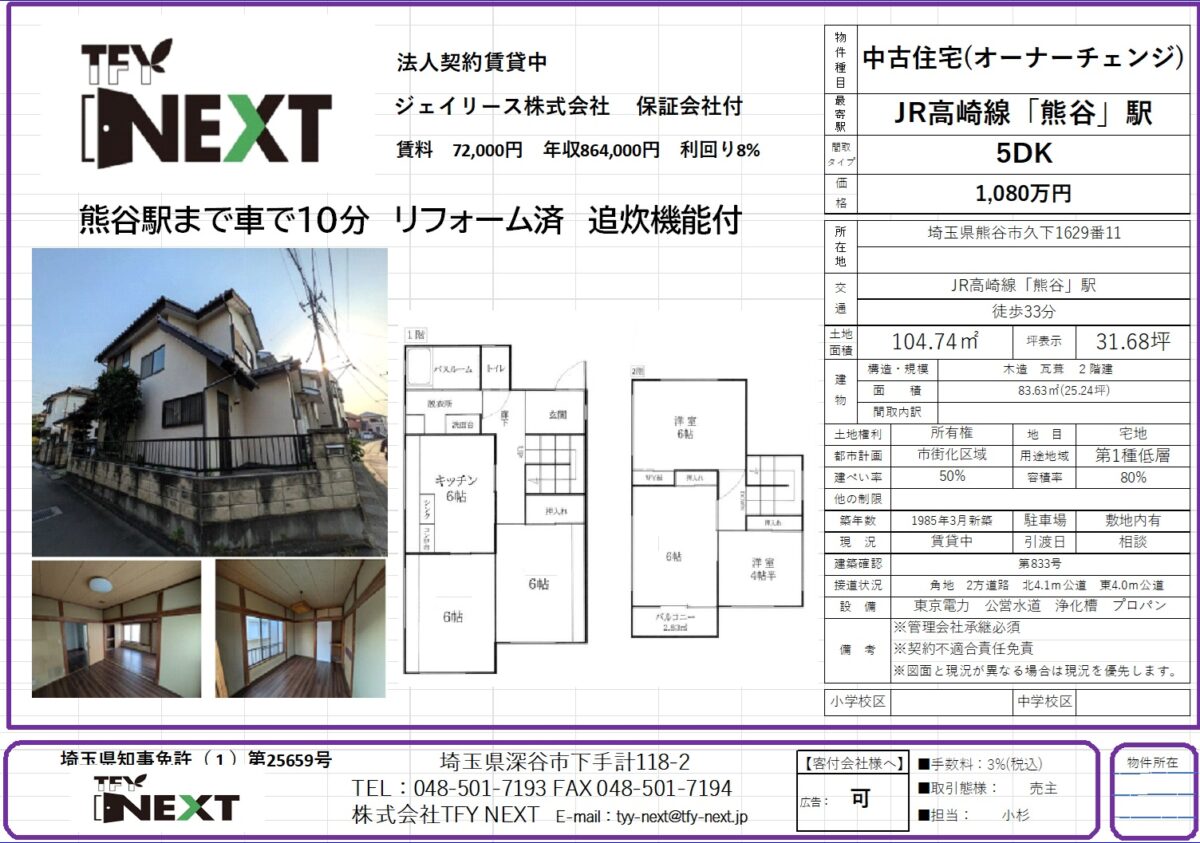埼玉県熊谷市久下 中古住宅(オーナーチェンジ) 投資物件 2025 10/14 物件情報 2025.10.14 熊谷駅まで車10分の好立地 室内リフォーム済 法人契約賃貸中 保証会社付 建物外部内部もしっかりとした造りです。 弊社売主物件ですので 仲介手数料がかかりません。諸条件等も相談にのりますので是非 ご検討ください 物件情報 シェアはこちら URLをコピーしました! 埼玉県上尾市平塚 特定技能・技能実習生 受入企業向き 貸寮 埼玉県深谷市下手計売地 205.39坪 住宅 アパート 蓄電池用地 関連記事 埼玉県深谷市下手計売地 205.39坪 住宅 アパート 蓄電池用地 2025.10.14 埼玉県上尾市平塚 特定技能・技能実習生 受入企業向き 貸寮 2025.10.14