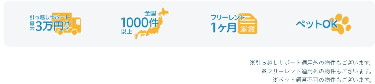 ・引越しサポート(家賃1ヵ月分の金額(上限3万円))サポート金額の範囲内で家賃からキャッシュバック