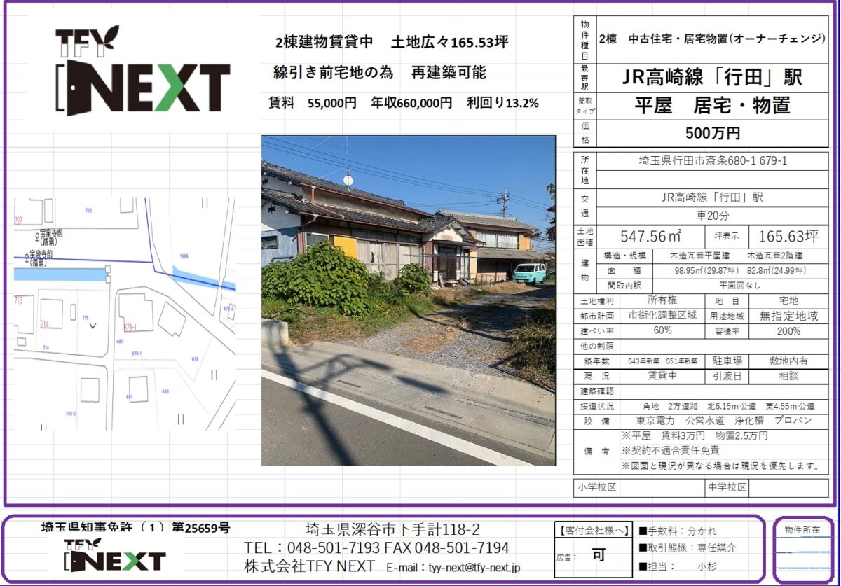 埼玉県行田市に取得しやすい収益物件の販売開始です。 販売価格 500万円